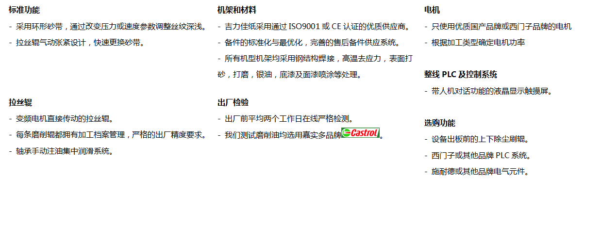 該系列設備有干拋或油拋兩種加工方式。經過轉速極低的砂輥,通過調整砂輥向下的壓力,使套在砂輥外部的環形砂帶在金屬表面拉出直紋。經過機組加工的直絲HL(Hair-Line)金屬板材,表面紋理清晰,縱向2米長度內直紋紋理的偏斜不超過2mm。